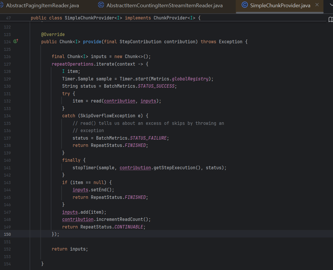 chunkPrivider.provide 메소드에서 Item을 ChunkSize만큼 반복해서 읽은 뒤 Input Chunk로 만들어서 반환한다.