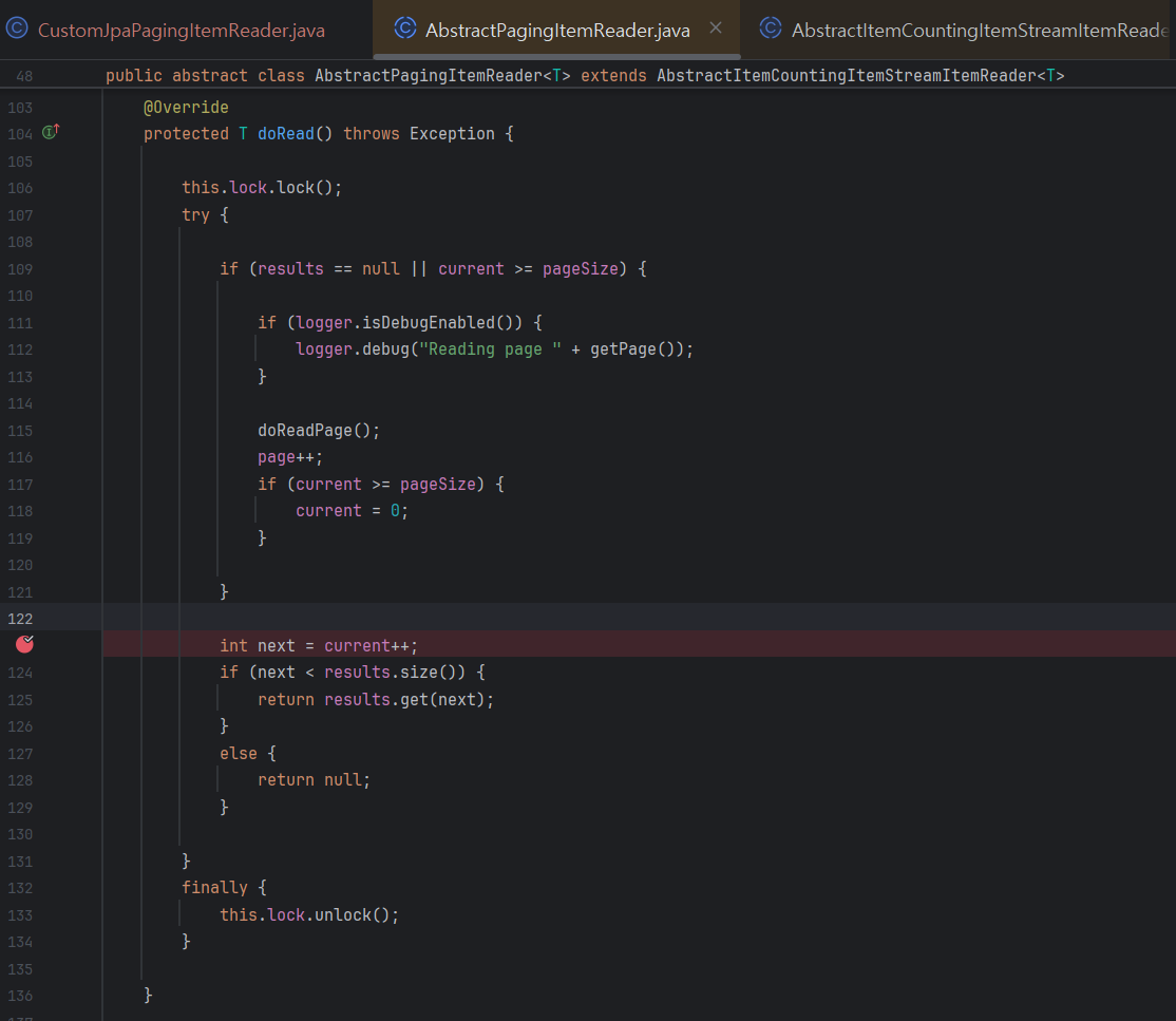 쿼리 결과(조회된 로우들)가 없거나 현재 인덱스(current)가 페이지 크기(pageSize=chunkSize) 이상이면 doReadPage가 호출된고, 읽을 데이터가 남아있으면 해당 데이터를 반환하게 된다.